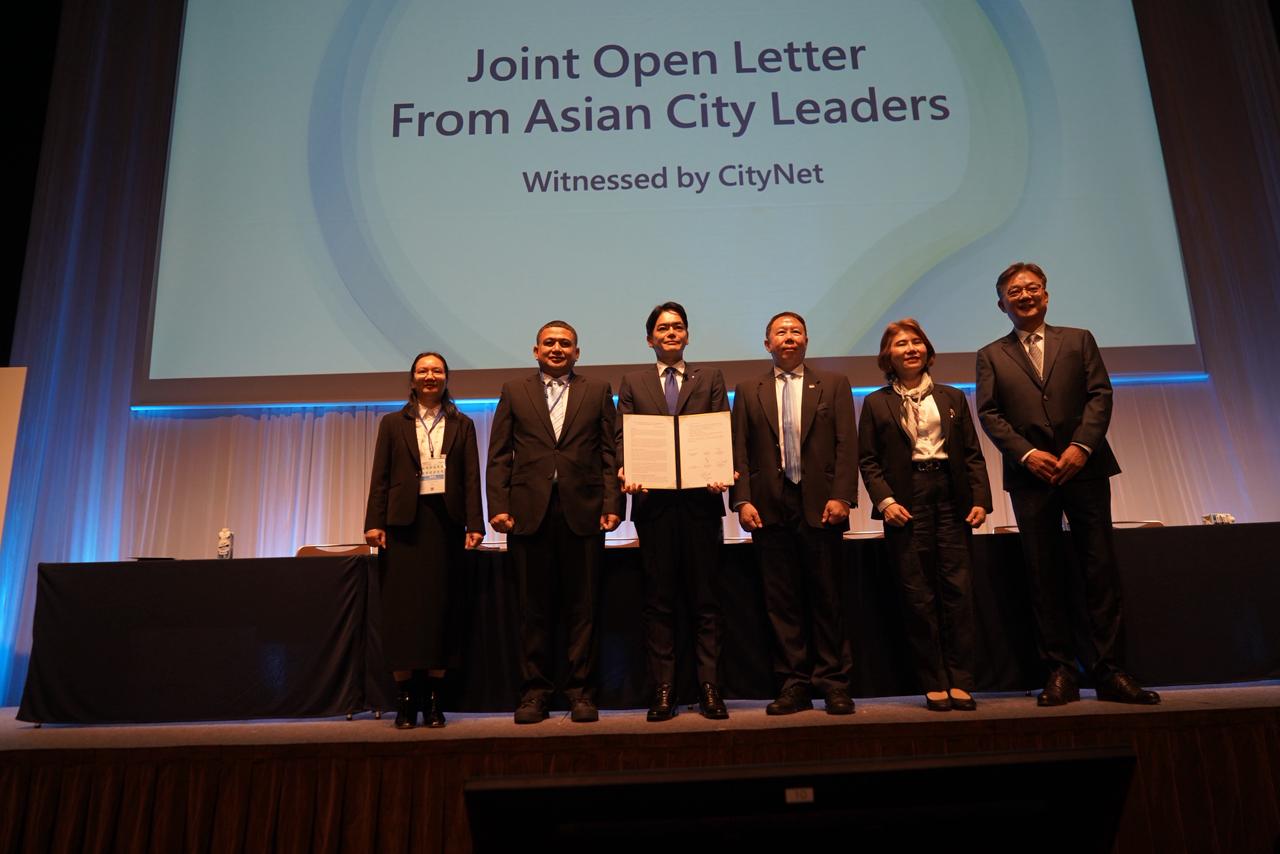 Para wali kota dan pemimpin kota Asia melakukan penandatanganan publik (public signing) sebagai bentuk komitmen menuju ekonomi sirkular, netral karbon, dan pembangunan kota berkelanjutan.